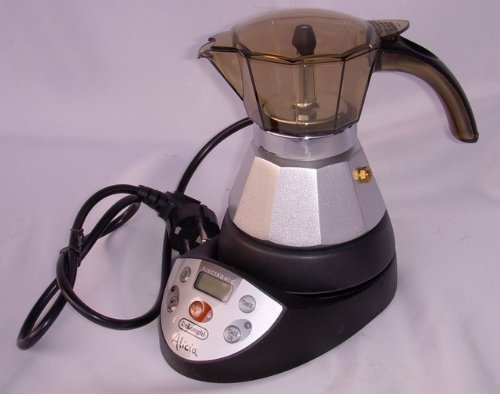 Description : "Alicia" coffee pot is the electric version of the famous "Moka". The boiler is made of alloy’s aluminium, suitable for food use, while the top is in transparent material to better monitor the progress of the coffee. The preliminary operations are the same as the traditional coffee pot: put the water in the bottom boiler, the ground coffee into the funnel filter, screw back and put the coffee on the basis of power. Press the on/off switch and after a few minutes the coffee will begin to ooze out. At the end, on the display will appear the written "end" at the same time the emission of three marks them acoustic that signals the extinction automatic rifle. This model is equipped also of the function "self-ingition programmed" that it allows to program the hour of self-ingition and the automatic function "keep warm", useful in order to maintain the coffee to the just temperature until about half an hour after the distribution of the coffee.