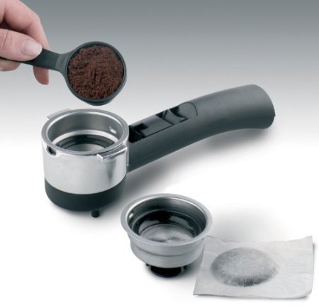 Patented filter - Used with grounded espresso, this unique filter mixes air into the brewing process to produce a perfect crema. Distinguished by its caramel color, the crema is essence of authentic espresso. The filter also accommodates E.S.E (Easy Serving Espresso) pods, available from Illy and other major coffee manufacturers.