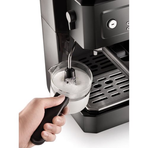 The DeLonghi Combination Coffee, Cappuccino and Espresso Machine has a 24-hour programmable timer so you can wake up to the aroma of fresh-brewed coffee every morning. The DeLonghi Cappuccino and Espresso Machines Flavor Saver brewing system fully saturates and steeps the coffee for a full, robust flavor every time you brew. The DeLonghi Pause 'n Serve feature allows you to enjoy a cup before the full pot is brewed while the Freshness Indicator lets you know how long the coffee has been standing. This DeLonghi 3-in-1 Combination Espresso and Drip Coffee Machine also lets you prepare espresso and cappuccino. Enjoy cappuccinos, lattes and hot chocolate with the "Swivel Jet" frother. DeLonghi Combination Espresso and Cappuccino mixes steam and milk to create a rich, creamy froth for perfect drinks every time.
