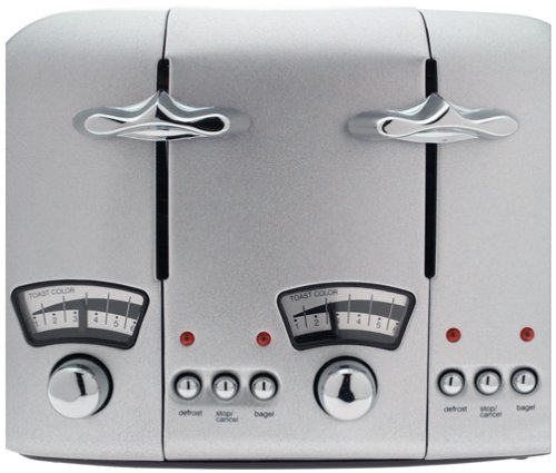 Description : It's got style, it's got substance, it's the sleek retro styled toaster from De Longhi, the renowned Italian appliance company, with room for 4 slices of bread in its extra long, extra wide slots. This is one appliance to which you won't begrudge valuable counter space.Elvis would have loved this toaster. With a brushed-metal finish like a customized '57 Chevy, chrome lift-levers and browning-control knobs, and control dials like old-time radios, it's lovingly and wittily retro. Functionally, however, it's 21st century. Four large slots, each 5-1/2 by 1-1/4 inches, handle bagels, English muffins, and thick gourmet breads as well as conventional bread. Slots are paired, each pair with its own lift-lever and browning control. Push a button, and bagels or English muffins toast only on one side. Push another button, and frozen bread automatically toasts a little longer to account for defrosting time. Slide open a crumb tray on the side and clean up with no hassle. At 12 by 11 by 8 inches, it's not compact, but, as was said about Elvis, when you've got it, flaunt it. --Fred Brack